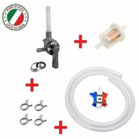 Kit complet de réparation essence : robinet (filetage diamètre M10 , pas de 100) + tuyau + filtre carburant + collier de serrage