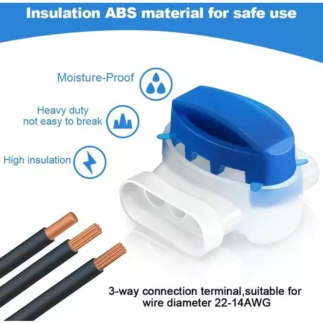 【Facile à utiliser】Le connecteur de câble pour tondeuse robot dispose de 3 trous, peut accueillir 2 ou 3 connexions de câbles. (Application : 0,5 mm² à 1,5 mm² de diamètre de fil). Vous pouvez connecter les extrémités des câbles avec ces connecteurs de câble. Insérez simplement les deux extrémités du câble jusqu’à la butée et pressez la partie bleue du connecteur avec la pince.
